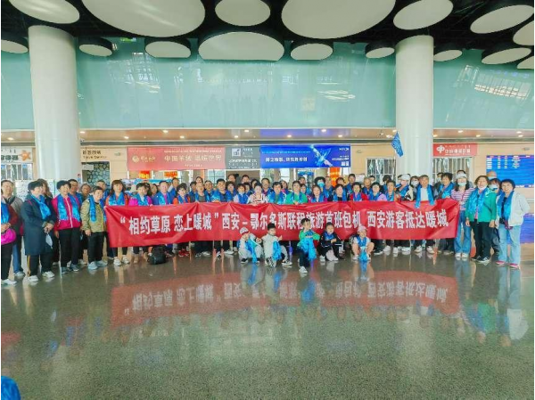 從陜西省西安市起飛的東航MU2323次航班載著100余名游客抵達鄂爾多斯市 開啟鄂爾多斯之旅