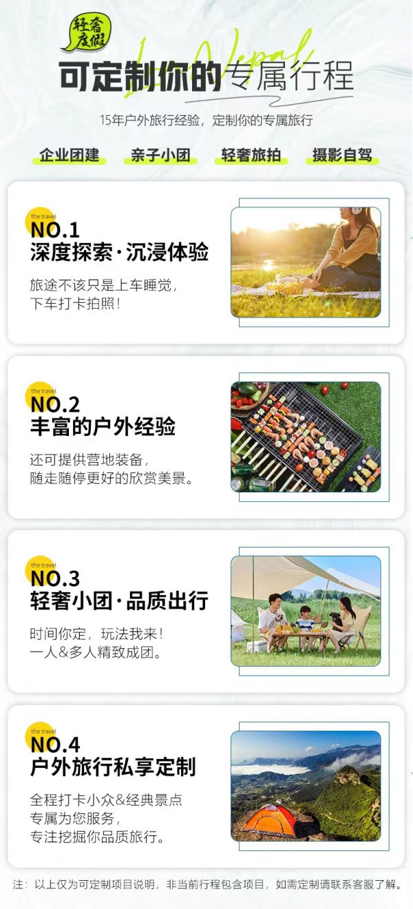 私人訂制:我們業務范圍囊括了全國各大城市,川西、西北、西藏、新疆,在路上永遠有我們的身影。我們將為每一個有定制需求的你策劃出獨屬于自己的完美旅行。