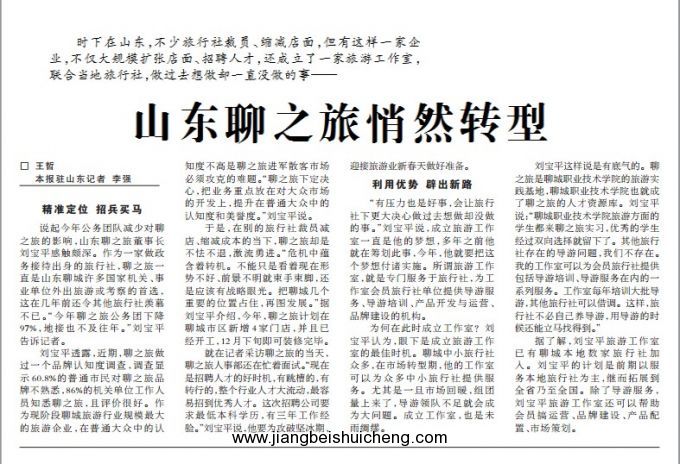 為何在此時成立工作室?劉寶平認為,眼下是成立旅游工作室的最佳時機。聊城中小旅行社眾多,在市場轉型期,他的工作室可以為眾多中小旅行社提供服務。尤其是一旦市場回暖,組團量上來了,導游領隊不足就會成為大問題。成立工作室,也是未雨綢繆。