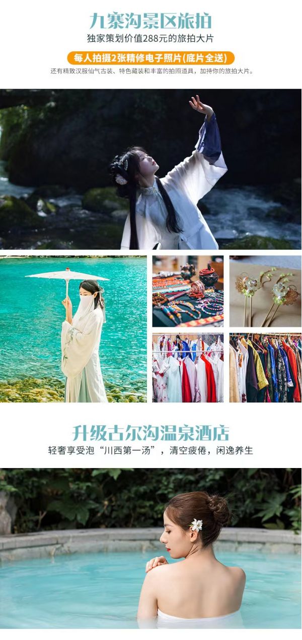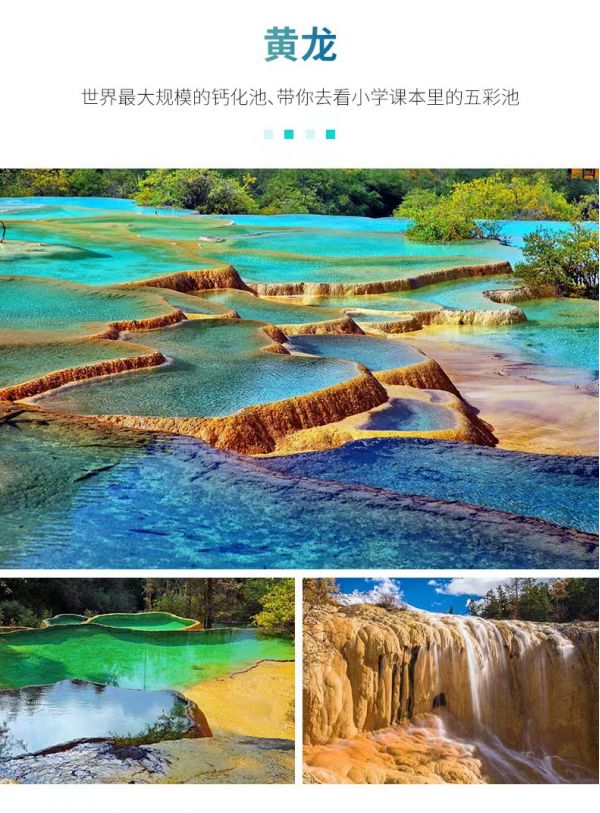 【黃龍風(fēng)景區(qū)】因其獨(dú)特的景觀、原始的生態(tài)和豐富的資源被美稱(chēng)為“人間瑤池”,在這里我們可以親身體驗(yàn)到“彩池、灘流、雪山、峽谷、古寺、民俗”六絕的獨(dú)特魅力。黃龍風(fēng)景區(qū)鈣化景觀非常壯觀,鈣化邊石壩彩池、鈣化灘、鈣化扇、鈣化湖、鈣化塌陷湖、坑,以及鈣化瀑布、鈣化洞穴、鈣化泉、鈣化臺(tái)、鈣化盆景等一應(yīng)俱全,是一座名副其實(shí)的天然鈣華博物館。乘坐索道后,我們繼續(xù)沿觀光道往景區(qū)最高點(diǎn)——五彩池、黃龍寺方向徒步,再順著游客道便能走出景區(qū);體力有限的游客也可以選擇不行返回索道口,自費(fèi)乘坐索道離開(kāi)景區(qū)。