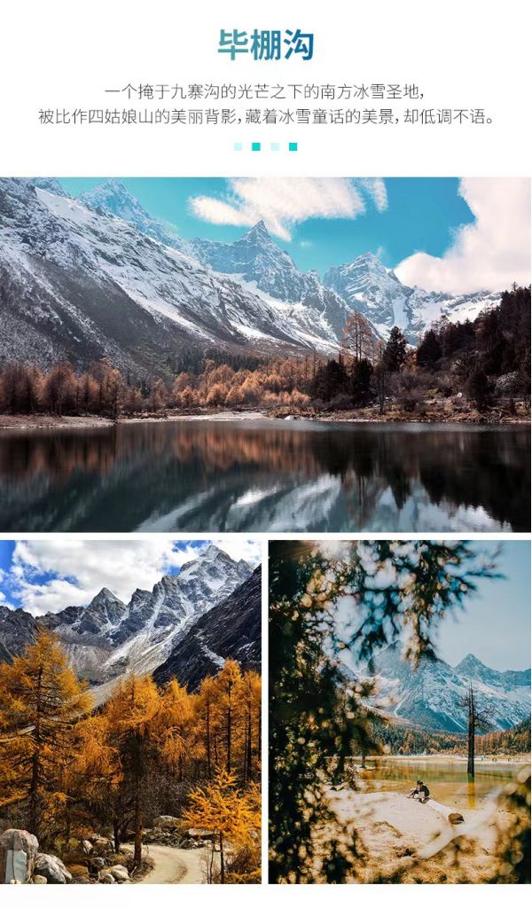 有“四姑娘山后花園”美譽(yù)的畢棚溝(不含景區(qū)觀光車(chē)60元/人-上行游客中心-龍王海/下行娜姆湖酒店-游客中心),溝內(nèi)有原始森林、絢麗多彩的植被、雪山溫泉,景觀豐富,一年四季各有各的美。初春時(shí)節(jié)斑駁著枯色的山林正漸漸蘇醒,枝丫生出新的綠色希望,溪流才開(kāi)始解凍,半冰半水潺潺流動(dòng),垂卷而下的百米瀑布如白砂裹雪;夏季,那些綠的希望已匯成一片汪洋,瀑布喧鬧得歡騰而下,踱步原始森林中蜒曲的小道,遠(yuǎn)眺藍(lán)天高山,奇特的萬(wàn)年冰川,感受城市中沒(méi)有的舒爽;