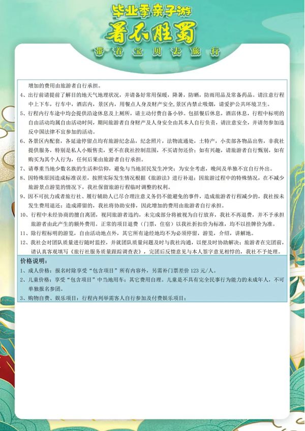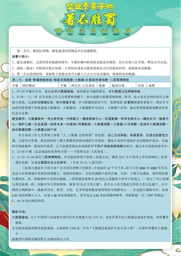 成都雙飛6日游 聊城發團 純玩 無購物 成都 都江堰 熊貓基地 三星堆 三蘇祠黃龍溪 川菜博物館 川劇表演 自由活動 ...... 發團時間 20230616 20230618 20230620 20230630 價格 3990 4290 報名電話 0635 8681234