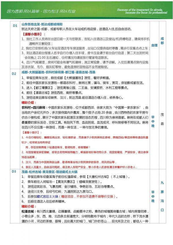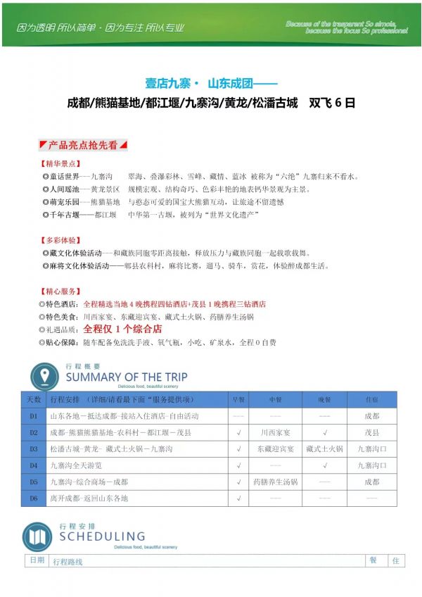 成都-九寨溝雙飛6日游 聊城發(fā)團(tuán) 純玩 無(wú)購(gòu)物 成都 熊貓基地 都江堰 九寨溝 黃龍 松潘古城 ...... 價(jià)格 3190 3490 報(bào)名電話 0635 8681234