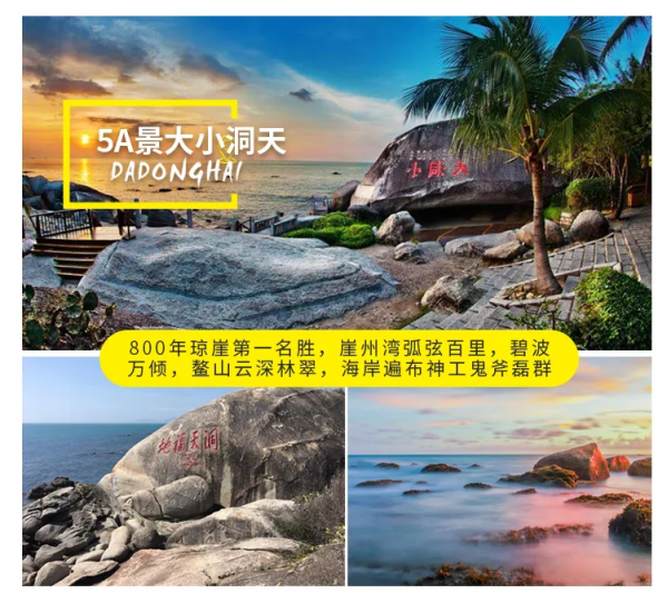【大小洞天】(游覽時間不少于120分鐘)5A級景區(qū)洞天福地,壽比南山不老松的山海奇觀,這里海天一色,海風(fēng)習(xí)習(xí),椰林婆娑,如詩如畫,“碧海連天遠(yuǎn),瓊崖盡是春”嘆為觀止的800年崖州第一景觀;