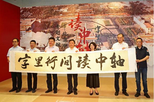 活動(dòng)開(kāi)幕儀式現(xiàn)場(chǎng),北京市文物局副局長(zhǎng)褚建好,北京市文化和旅游局副局長(zhǎng)王洪濤,北京市東城區(qū)副區(qū)長(zhǎng)唐立,展覽主辦單位以及北京京企中軸線(xiàn)保護(hù)公益基金會(huì)的嘉賓共同展開(kāi)寫(xiě)有“字里行間讀中軸”的卷軸,一場(chǎng)講述壯觀中軸、人文中軸、多彩中軸的展覽正式拉開(kāi)序幕。