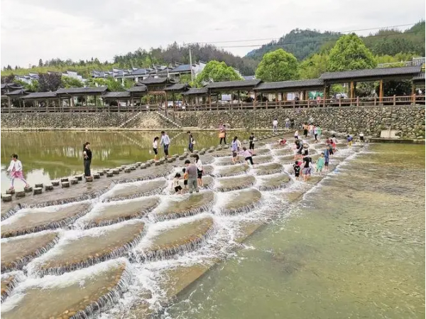 來到崇際村網紅打卡景點龍鱗壩,只見全長45米的長壩由一個個矴步組成。溪水穿過撞擊矴步后,形成層層疊疊的白色水花,既壯觀又解壓,成了市民游客喜愛的打卡點。來自上海的游客張莉說:“這里的生態太好了,水非常清澈,踩在水花里打水仗,很好玩。”