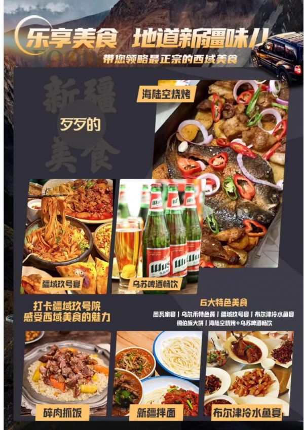 4.景點:行程中所列景點首道門票及區間(天池門票、喀納斯門票、禾木門票、可可托海門票、魔鬼城門票、五彩灘、那拉提、巴音布魯克門票)