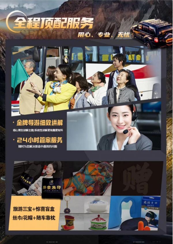 11.贈送:全程每人每天1瓶礦泉水/女士絲巾/男士花帽/干果小禮包/驚喜盲盒/隨車抱抱枕/旅游三寶.