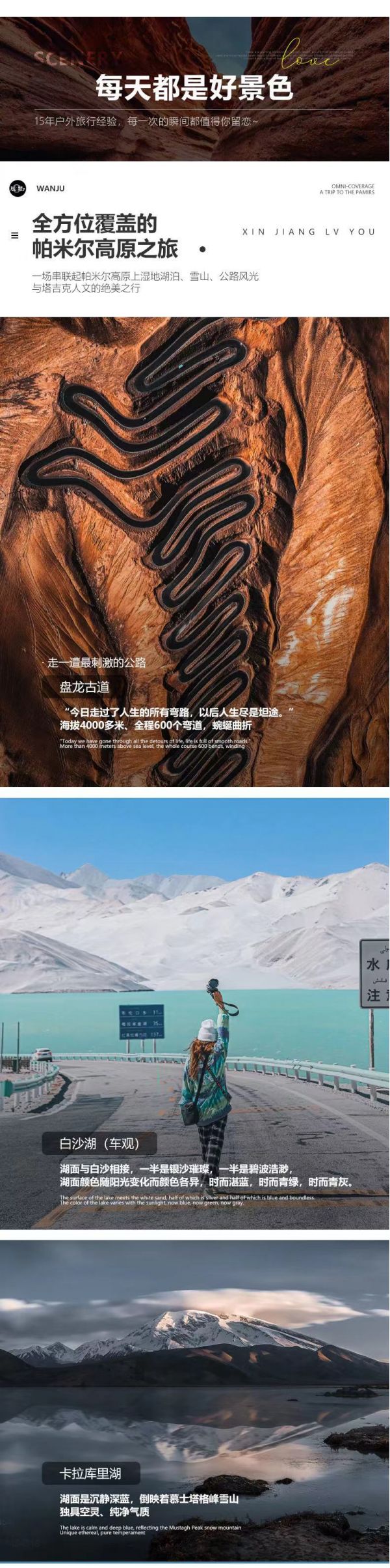 告別“東方摩洛哥”—喀什,我們將開啟一段帕米爾高原之旅。沿314國道一路暢游帕米爾高原風光,首先驚艷我們的是背靠白色沙丘和雪山的【白沙湖】,在陽光的變化下,湖水時而呈湛藍色,時而呈綠色。更令人驚嘆的是,藍色的湖面與白沙相接,一半藍一半白,而白沙背后還有雪山。在雪山和白沙的映襯之下,白沙湖水更顯澄澈。在這里能get湖泊、白沙、雪山同框的畫面。分享一個冷知識:白沙湖又名流沙河,就是西游記里唐僧收服沙和尚的地方。我們還能途觀慕士塔格峰,山頂常年皚皚白雪,猶如滿頭白發,十余條冰川鑲嵌在峰體下的峽谷中,如胸前飄動的銀須,故有“冰山之父”的美稱。隨后我們將遇見【卡拉庫里湖】,這里能看到雪山倒映在湖面的風景,拍出來的照片特別的給人純凈的感覺。