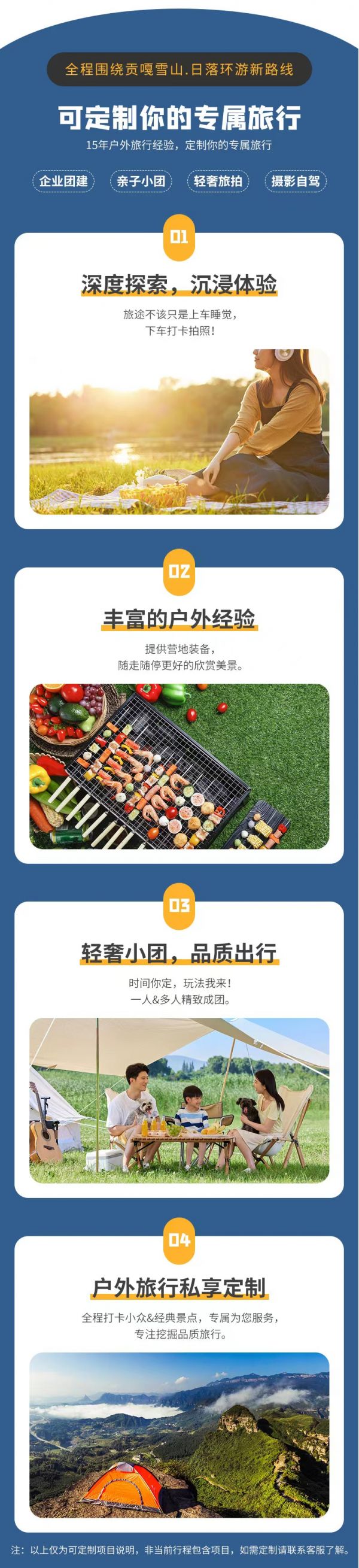 私人訂制:我們業務范圍囊括了全國各大城市,川西、西北、新疆、西藏,在路上永遠有我們的身影。我們將為每一個有定制需求的你策劃出獨屬于自己的完美旅行。