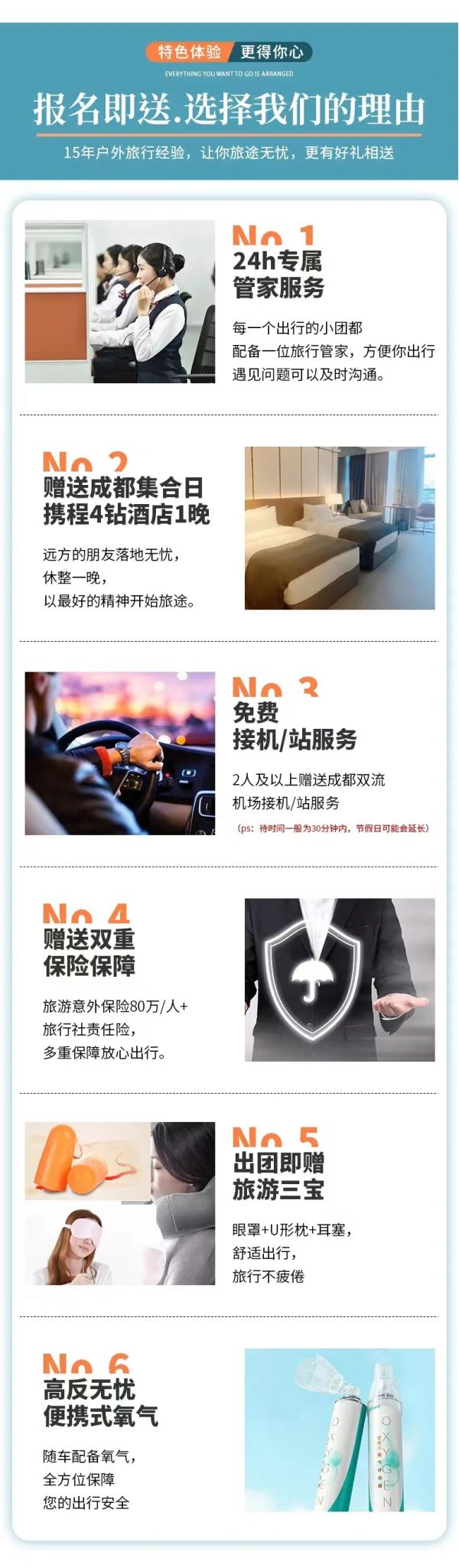 1、關(guān)于車輛交通:目前四川旅游市場8座以下車輛無法辦理旅游牌照,請游客知悉,以此理由提起的投訴我方拒不受理,望您諒解。