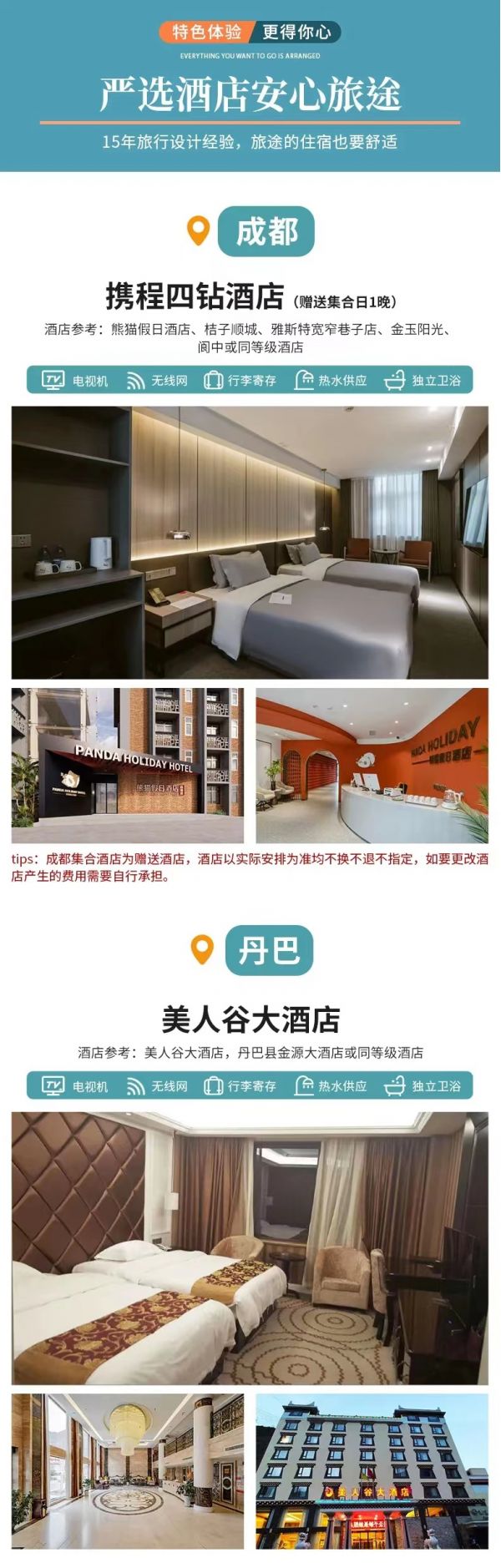 tips:成都集合酒店為贈送酒店,酒店以實際安排為準(zhǔn)均不換不退不指定,如要更改酒店產(chǎn)生的費用需要自行承擔(dān)。