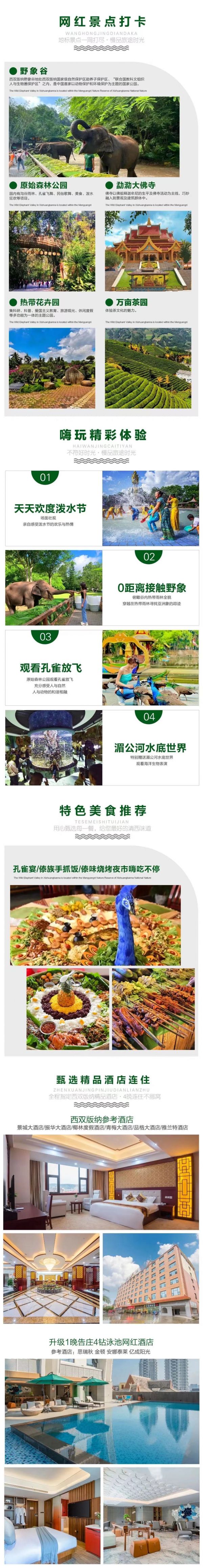 園內森林覆蓋率超過 98%,是個天然的大氧吧。氣候溫暖濕潤,樹木蔥蘢,蔓藤盤根錯節,不少珍禽異獸,如亞洲象,犀鳥,孔雀,黑冠長臂猿都生活在這片熱帶叢林里。品種繁多的熱帶植物遮天蔽日,龍樹板根、獨木成林、老莖生花、植物絞殺等植物奇觀異景隨處可見,峽谷幽深、烏鳴山澗、林木蔥茂、湖水清澈,讓您真切感受到大自然的神秘。愛伲寨的搶親、潑水節的歡暢、各民族的歌舞表演,任游客親身參與,使游客置身于濃郁的民族風情中留連忘返。孔雀開屏迎賓,猴子與人嘻戲,黑熊、蟒蛇、蜥蜴、穿山甲等珍稀動物,讓您見識真正的動物王國,讓游客充分感受人與自然、人與動物的和諧相融。