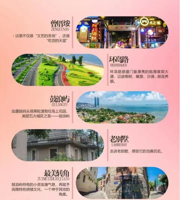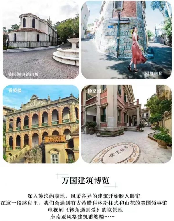 網(wǎng)紅打卡拍照點:①「最美轉(zhuǎn)角」②「曉學(xué)堂·蟲洞書店」③「協(xié)和禮拜堂」④「天主教堂-萬國領(lǐng)事館建筑博覽」⑤「怡園-林鶴年故居」