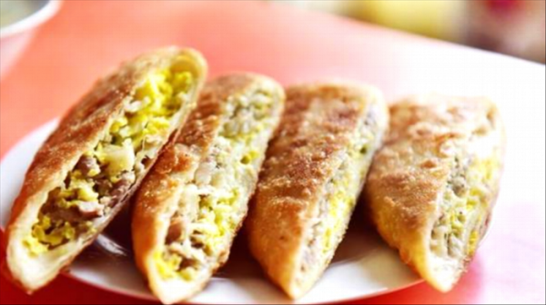 沙鎮(zhèn)呱嗒用料講究,必須是精細(xì)白面,用上等的動物油和植物油煎制,并加入其他佐料。其餡料有肉餡、雞蛋餡、肉蛋混合餡等多種,隨季節(jié)變化,按不同比例制作。以風(fēng)攪雪為例,聽此名如雪景般迷人,緋紅的鮮肉中,環(huán)繞的是黃的白的雞蛋,像一陣陣旋風(fēng),盤旋攪擾起片片雪花,風(fēng)起云涌,席卷味蕾。