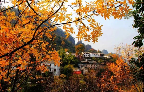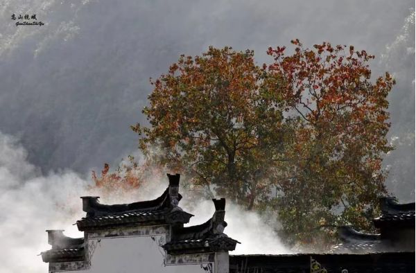 塔川烏桕樹經過霜降,由綠變黃,由黃變紅,漸變出調色板般豐富的色彩。塔川的清晨極美,薄薄的霧氣似有似無,籠罩在山腰,林間,農家的小屋若隱若現,紅楓叢中小露飛檐翹角,黃葉微隙掩映粉墻黛瓦,如中國山水畫般詩情畫意。