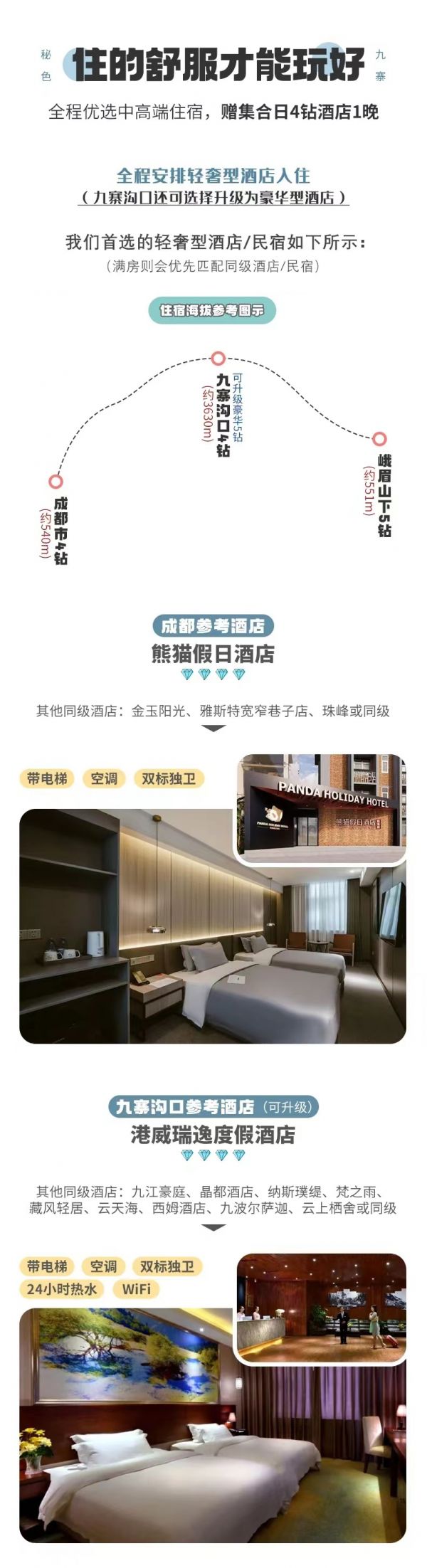 3、當天返回成都時間約在下午的21:30左右,由于不能預估有可能堵車等不可抗力因素情況,建議客人不要預定當天返程的火車或是飛機,以免因為堵車給您帶來沒有必要的損失。若因自行預定當天大交通造成延誤的,我社不賠償任何費用,不承擔任何責任!敬請知曉。