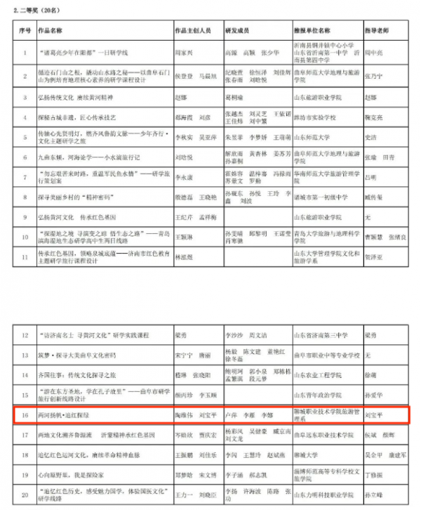 由山東省總工會、山東省文化和旅游廳、山東省新舊動能轉換綜合試驗區建設辦公室、山東省人力資源和社會保障廳、山東省教育廳、山東省農業農村廳、山東省精品旅游促進會共同主辦,山東省精品旅游促進會組織實施的“2023第四屆山東省研學旅行創新線路設計大賽暨首屆山東省研學旅行指導師技能大賽”的評審工作,嚴格按照統一報名參賽、網絡投票、專家評審、組委會審核等程序,研究確定了獲獎名單。聊城職業技術學院旅游管理系師生工作室團隊不負眾望,喜獲“2023第四屆山東省研學旅行創新線路設計大賽”二等獎。