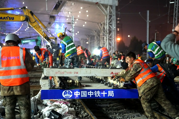 11月16日凌晨,在濟南火車站,由中鐵十局承建的濟鄭高鐵山東段濟南站站改工程順利完成,標志著濟鄭高鐵正式引入濟南站。圖為在濟南火車站,中鐵十局的工作人員正在對濟鄭高鐵引入濟南站進行站改作業(yè)。
