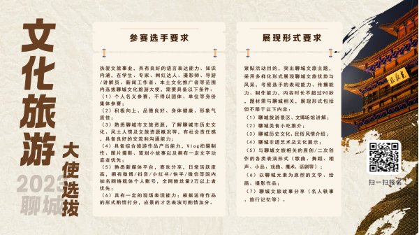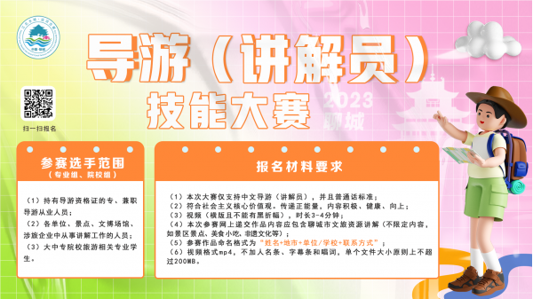 為深入貫徹落實(shí)省委、省政府《關(guān)于促進(jìn)文旅深度融合推動(dòng)旅游業(yè)高質(zhì)量發(fā)展的意見(jiàn)》,圍繞“文旅興市”目標(biāo)任務(wù),塑強(qiáng)聊城“兩河之約”文旅品牌,提升“江北水城·兩河明珠”城市品牌影響力和吸引力,助力建設(shè)青年友好型城市。聊城市啟動(dòng)“兩河之約·最聊城”2023聊城文化旅游大使選拔暨導(dǎo)游(講解員)職業(yè)技能大賽,2023年12月9日前,均可通過(guò)線上報(bào)名通道報(bào)名參賽。