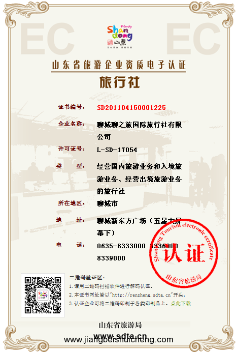聊之旅國際旅行社通過山東省旅游局旅游信息電子認證