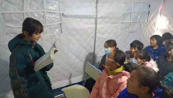 22號上午在位于甘肅省積石山縣石塬鎮肖紅坪村的一個臨時安置點,總臺記者在采訪時聽到了朗朗的讀書聲,這里搭建起了甘肅震區首個帳篷學校。