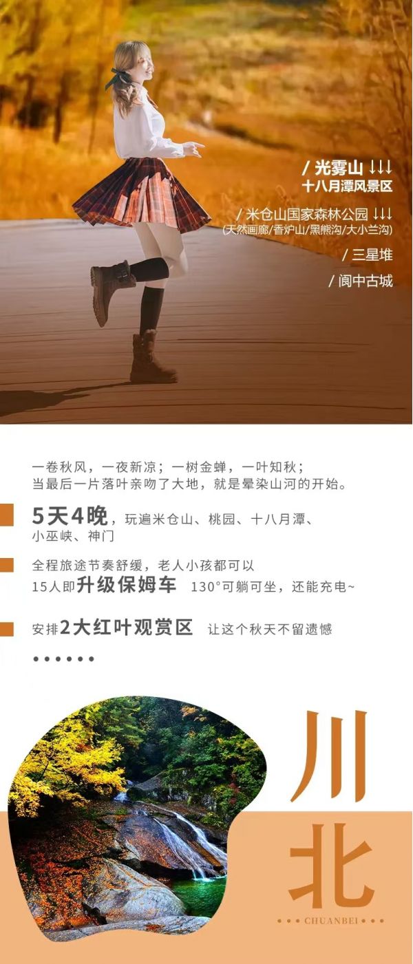 早餐后出發,經成巴高速抵達位于川東北的巴中【光霧山】,光霧山被譽為“中國紅葉第一山”,因常年云霧繚繞而得名,每年10月~11月是觀賞光霧山紅葉的最佳時機。【十八月潭】是藏在光霧山深處的動人篇章,曾有人說:十八月潭是川東北的“九寨溝”,瀑布似九寨,紅葉絕天下。在長約3.5公里的珍珠溝內,密布著18個恍若神造仙成的瀑潭,每個潭形似月桂,基本上有一相映的瀑布,謂之“十八月潭”。大小水潭似顆顆珍珠綴成的長長珠鏈,沿溝飛瀉的瀑流如粒粒珍珠鋪就的幅幅珠簾。漫步其間,潭水相連,時而穿過大片彩林,一瀉千里,時而一片靜謐,明凈幽藍。登高俯瞰,滿目流金瀉玉、彩虹波動,尤如串串珍珠藏于溝壑溪澗。步入十八月潭,如在畫中游,讓你陶醉得駐足不前。看過秋景后前往光霧山鎮入住。