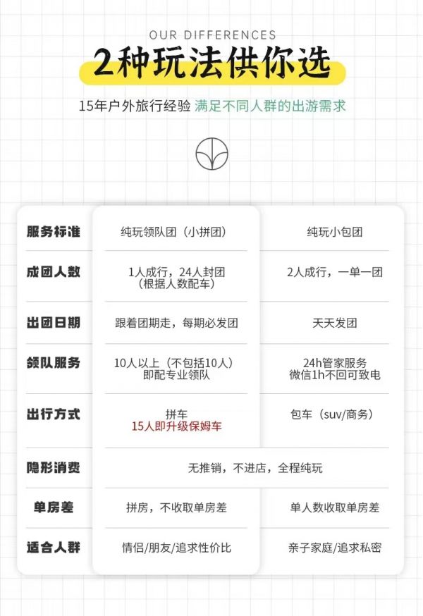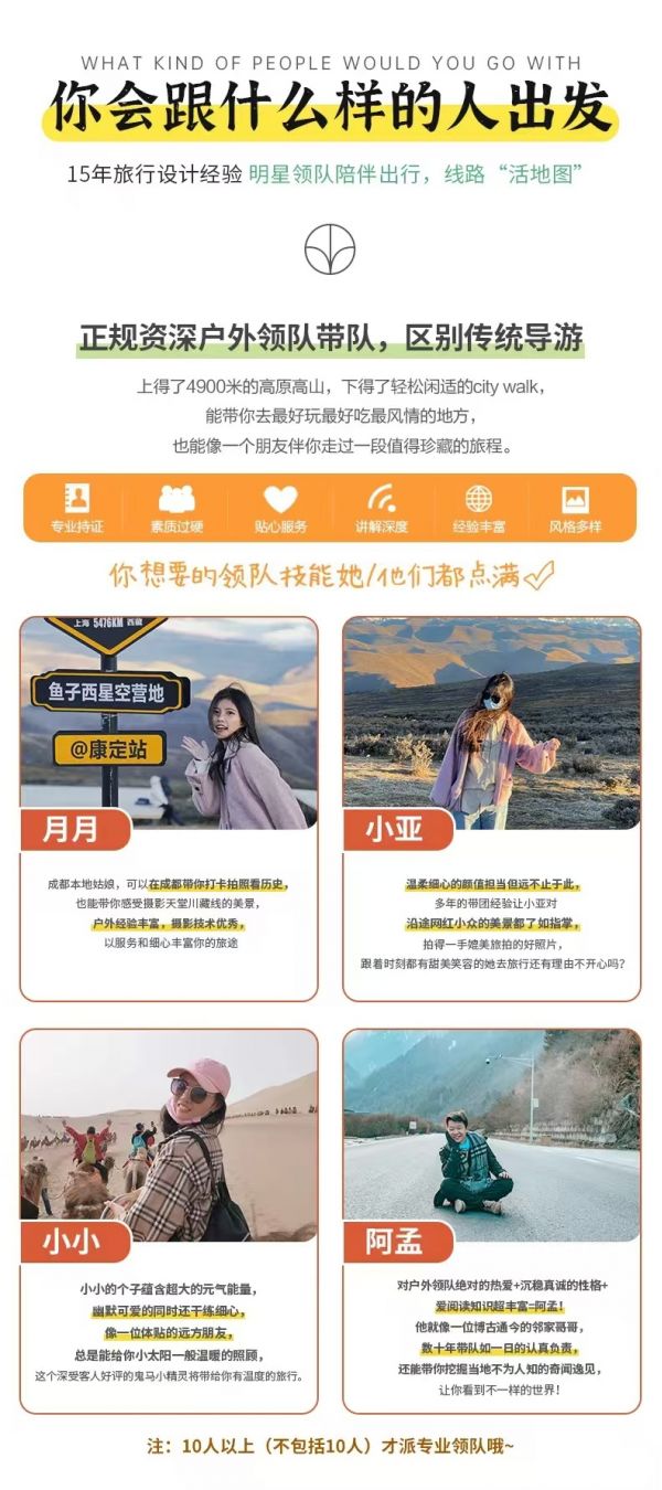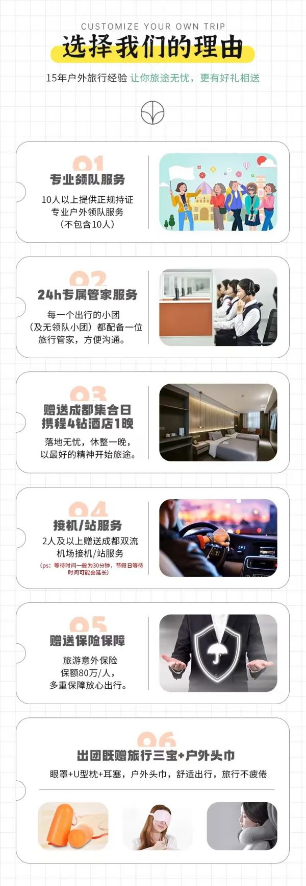 私人訂制:我們業務范圍囊括了全國各大城市,川西、西北、新疆,在路上永遠有我們的身影。我們將為每一個有定制需求的你策劃出獨屬于自己的完美旅行。