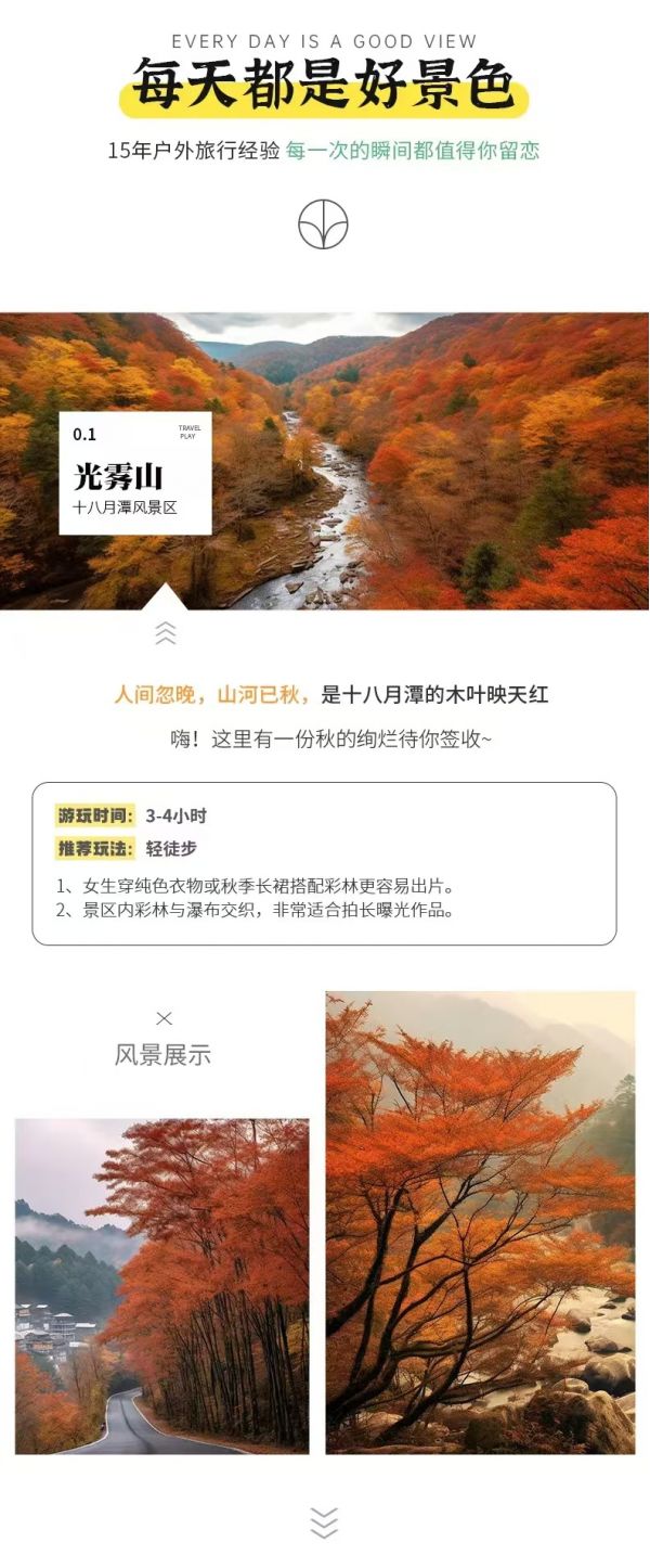 早餐后從從鎮上出發,約15分鐘便可抵達【米倉山國家森林公園(大壩景區)】,秋天向來是彩色的,巴中光霧山也漸漸開始展現出它最美的那面,紅葉一日一色,一步一景,紅得風韻特別,紅得多姿多彩,紅出了“丹楓爛漫錦裝城,要與春花斗眼明”的奇妙佳境,毫不夸張的說光霧山的秋天就是我心中的Top1。