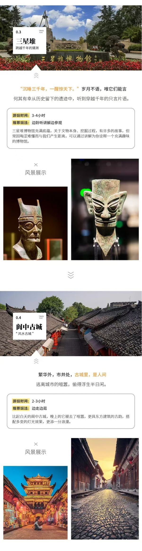 早晨從成都酒店出發,大家相互認識,相互熟悉,一路歡歌笑語,充滿期待。隨后抵達【三星堆博物館】開始參觀,三星堆古遺址距今已有3000至5000年歷史,是迄今在西南地區發現的范圍最大、延續時間最長、文化內涵最豐富的古城、古國、古蜀文化遺址。在這批古蜀秘寶中,有許多光怪陸離奇異詭譎的青銅造型,有高2.62米的【青銅大立人】、有寬1.38米的【青銅面具】、更有高達3.95米的【青銅神樹】等,均堪稱獨一無二的曠世神品。而以流光溢彩的金杖為代表的金器,以滿飾圖案的邊璋為代表的玉石器,亦多屬前所未見的稀世之珍。游覽后繼續出發,下午抵達【閬中古城】,古城山圍四面,水繞三方,有著2300多年的歷史,與安徽黃山的徽州古城、山西平遙的平遙古城和云南麗江的麗江古城并稱為中國四大古城,如果說麗江古城是風花雪月,那么閬中古城便是人間煙火,古城里時不時飄出的陣陣醋香更是久久縈繞在心頭,古城所蘊含的三國文化、春節文化、科舉文化更是值得深入探究。晚上我們入住古城周邊,比起白天的閬中古城,晚上的它褪去了喧囂,更具東方建筑的古韻,搭配多變的燈光效果,更添一分浪漫。