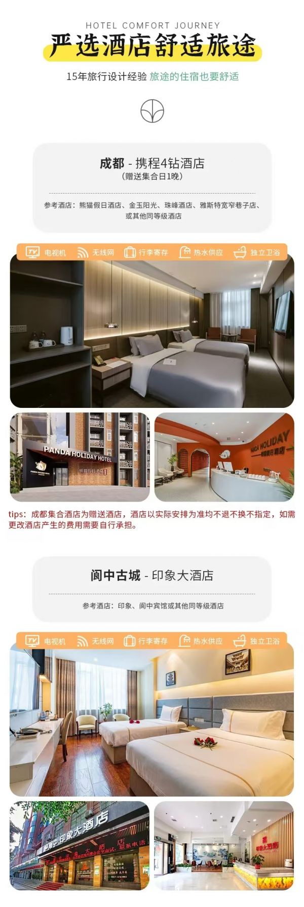 住宿:含全程4晚舒適酒店。(tips:成都集合酒店為贈送酒店,酒店以實際安排為準均不換不退不指定,如要更改酒店產生的費用需要自行承擔。)