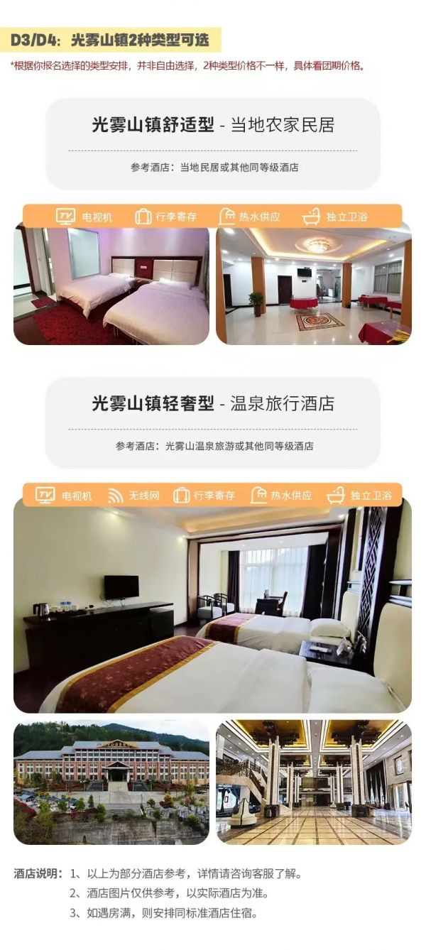 光霧山鎮因深處川東北山區,住宿條件有限,請大家對酒店合理期待,但我們提供了輕奢/舒適2檔類型酒店可供選擇。