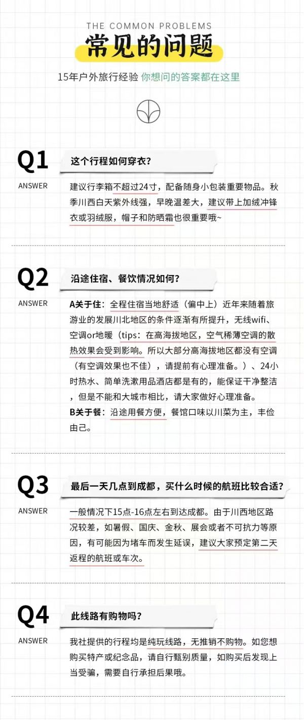 (2)正常情況下,抵達成都的時間為下午15:00-16:00,如果必須當日離開,請定18:00以后的回程大交通,以免耽誤行程,敬請諒解;