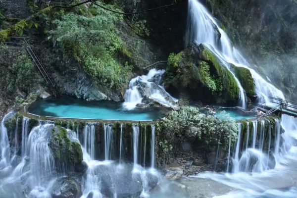 螺髻山九十九里溫泉不僅是世界第一大溫泉瀑布,還是世界唯一的掛壁溫泉、世界唯一的溫泉群島,由數(shù)十個(gè)大小不一的溫泉瀑布組合而成的一個(gè)寬達(dá)200余米的溫泉瀑布群。首先映入眼簾的是一泓清澈見底的大槽河,河流纏繞在青山綠水間,漫步在奔騰而下的大槽河畔,陣陣涼風(fēng)夾雜著水霧撲面而來,郁郁蔥蔥的山嶺上百瀑飛瀉,雄奇的靈崖異石,成群的瀑布形態(tài)各異;順著河流而上,聲響如雷,一簾高31米寬19米掛在懸崖峭壁之上的溫泉瀑布呈現(xiàn)在了眼前,銀簾空懸而掛,蒸騰彌漫、熱霧繚繞;崖壁上的天然小水池,被稱之為“鴛鴦池”,沐浴其間,聽滴水彈琴,享靈崖泉韻,觀簾外景物,撲塑迷離,恍若大虛幻景。
