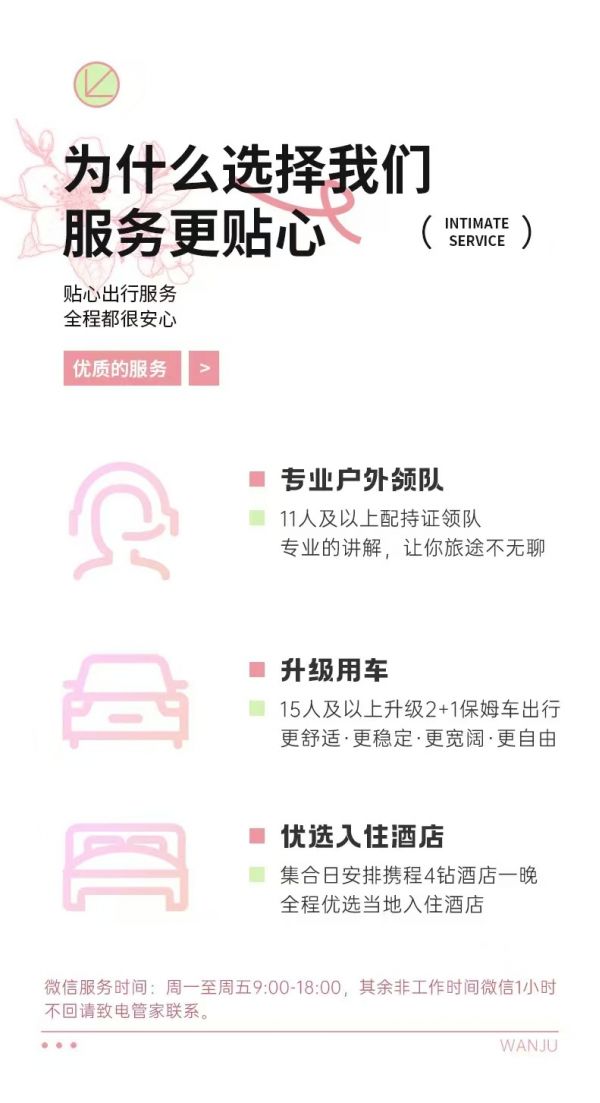 用車:15人及以上立即升級保姆車出行;為保證成團及質量,根據人數派不同座位數用車,保證每人一正座;包含司機一名、油費、:過路費、停車費,包含從出發地到景點及酒店費用,不包含晚間自由活動交通;
