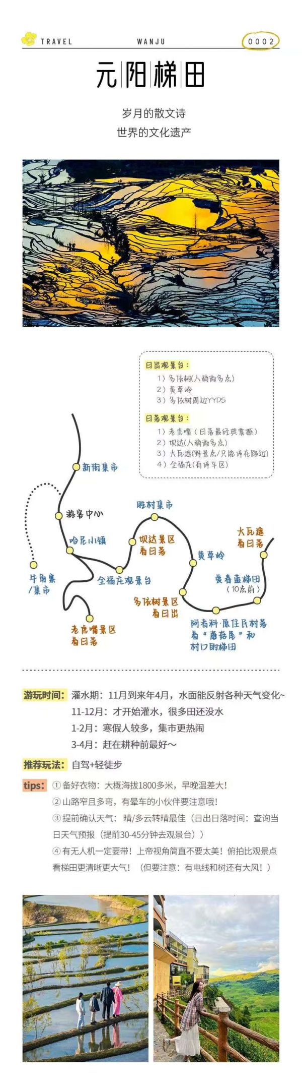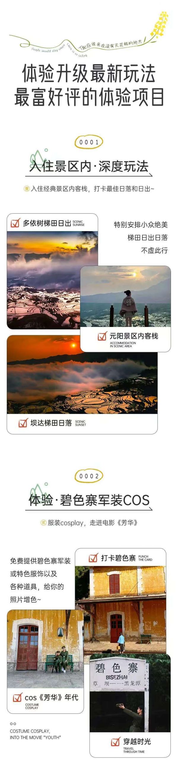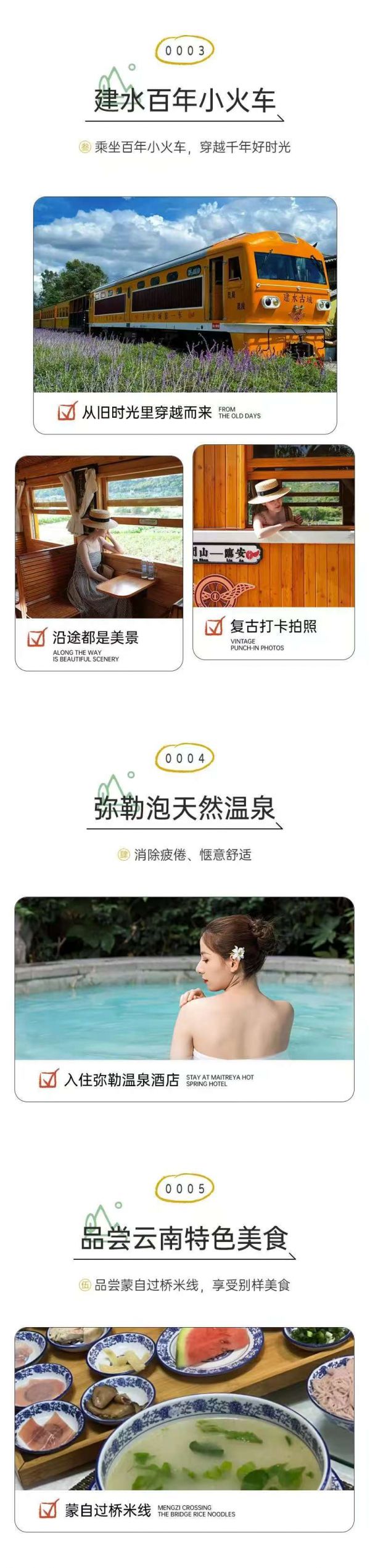 門票:包含元陽景區門票(元陽現實行單點單獨檢票制,我們購買為單次門票,不能重復進入景區,如果希望多次進入需另自費購門票)、 九龍瀑布景區門票、金雞嶺門票、蒙自電瓶車費、東風韻門票+景交、滇越小火車單程門票。