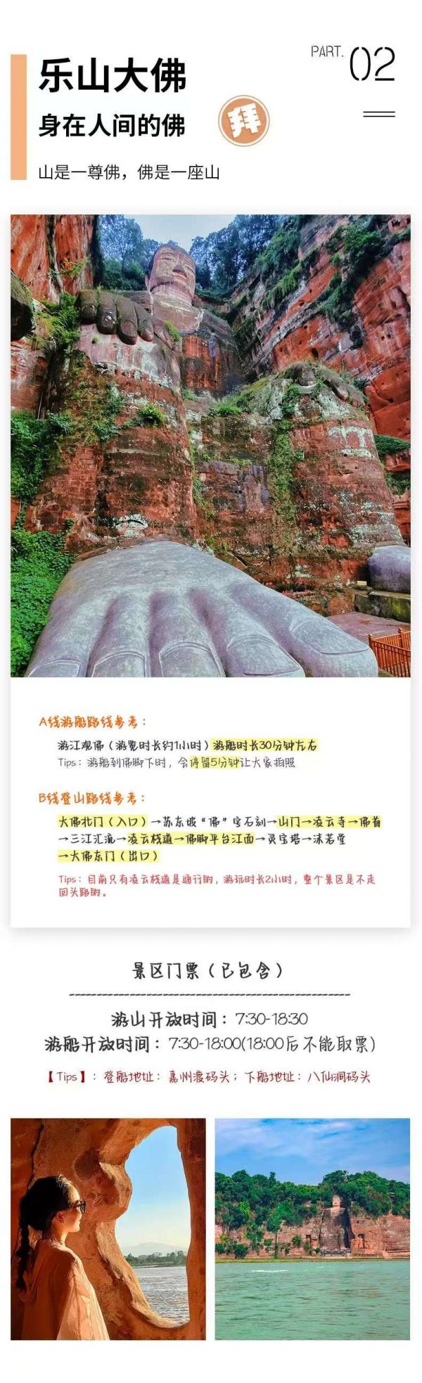 午餐后乘車前往【樂山大佛】景區,(門票已含,游覽約 1.5-2 小時)。觀賞世界第一大彌勒坐佛--樂山大佛、凌云寺、九曲摘道、大雄寶殿、靈寶塔,在瞻仰樂山大佛宏偉氣勢的同時,體驗”蜀道難、難于上青天的感覺”,抱千年佛腳后,游漫山的石刻佛像。