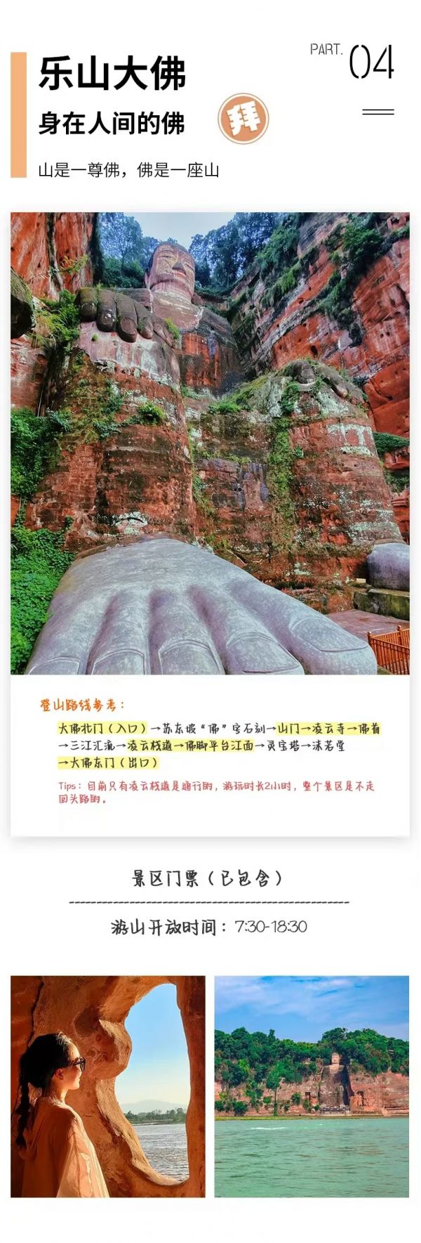 用午餐,品嘗世界非物質文化遺產-翹腳牛肉或峨眉地道九大碗(根據實際情況2選1安排),步行約15分鐘至迎春橋,乘坐旅游車來到樂山。深度登山游覽樂山大佛景區(參觀約3小時)步行333個臺階到達山頂,觀賞世界第一大彌勒坐佛-樂山大佛、凌云寺、九曲摘道、大雄寶殿、靈寶塔,在瞻仰樂山大佛宏偉氣勢的同時,體驗”蜀道難、難于上青天的感覺”,抱千年佛腳后,游漫山的石刻佛像、凌云寺、靈寶塔從東門下山返回到停車場。