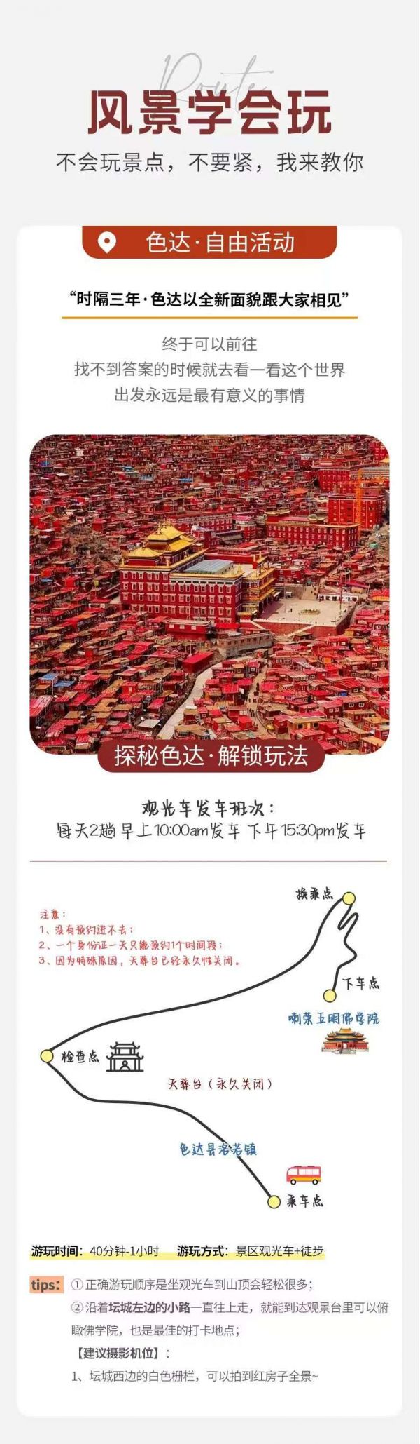 1、觀覽人員請務必注意各自所購買票務乘車點位。因色達當地情況特殊景點必須乘坐景區交通,還望游客諒解!