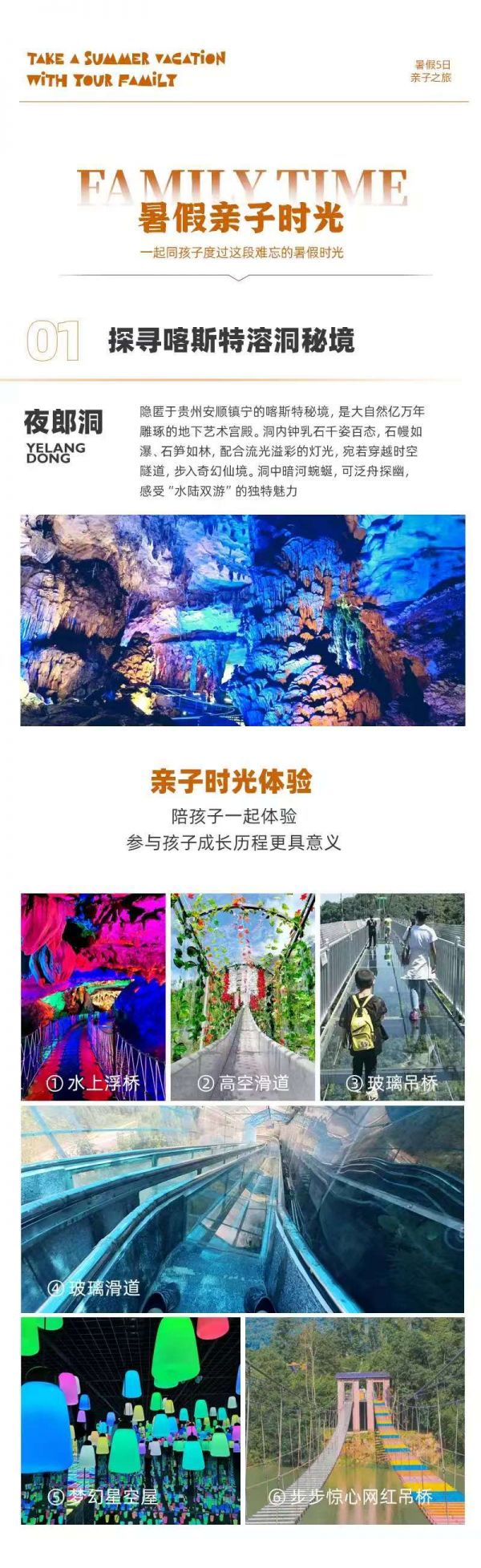 上午:酒店早餐后乘車前往探洞【夜郎洞】(成人兒童均已包含景區(qū)內(nèi)套票:水上浮橋—高空滑道—玻璃吊橋—玻璃滑道—夢幻星空屋—步步驚心網(wǎng)紅橋),隱匿于貴州安順鎮(zhèn)寧的喀斯特秘境,是大自然億萬年雕琢的地下藝術(shù)宮殿。洞內(nèi)鐘乳石千姿百態(tài),石幔如瀑、石筍如林,配合流光溢彩的燈光,宛若穿越時空隧道,步入奇幻仙境。洞中暗河蜿蜒,可泛舟探幽,感受“水陸雙游”的獨特魅力。還有各項體驗項目: