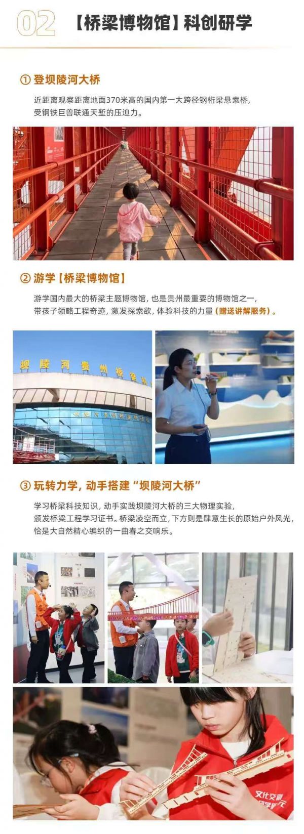 1、游學國內(nèi)最大的橋梁主題博物館,也是貴州最重要的博物館之一,帶孩子領(lǐng)略工程奇跡,激發(fā)探索欲,體驗科技的力量(贈送講解服務(wù))。