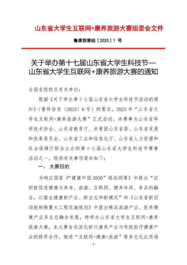 根據《關于舉辦第十七屆山東省大學生科技節活動的通知》(魯科協發〔2025〕6 號)的要求,2025 年“山東省大學生互聯網+康養旅游大賽”正式啟動。本賽事為山東省科學技術協會、山東省教育廳、共青團山東省委、山東省發展和改革委員會、山東省工業和信息化廳、山東省人力資源和社會保障廳聯合主辦的第十七屆山東省大學生科技節賽事 活動之一,現將有關事項通知如下: