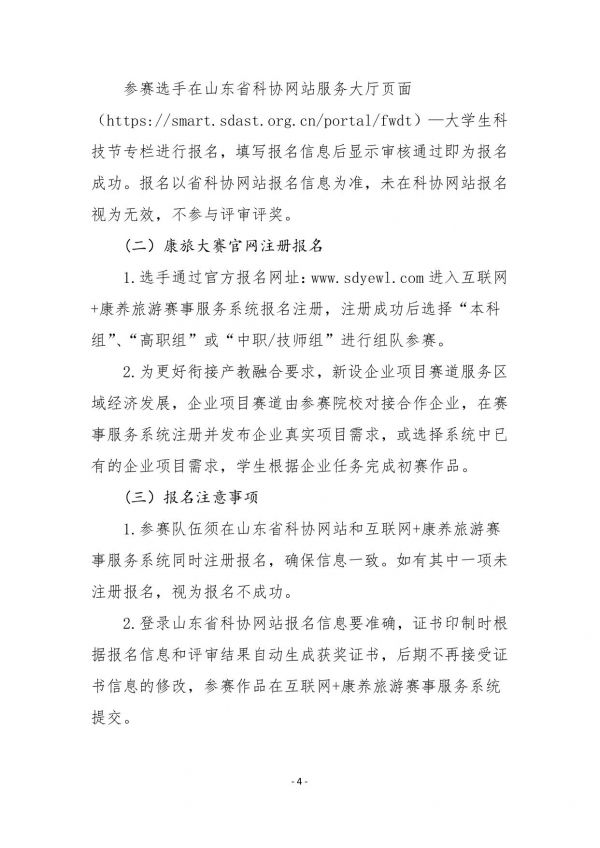 1.參賽隊伍須在山東省科協網站和互聯網+康養旅游賽事服務系統同時注冊報名,確保信息一致。如有其中一項未注冊報名,視為報名不成功。