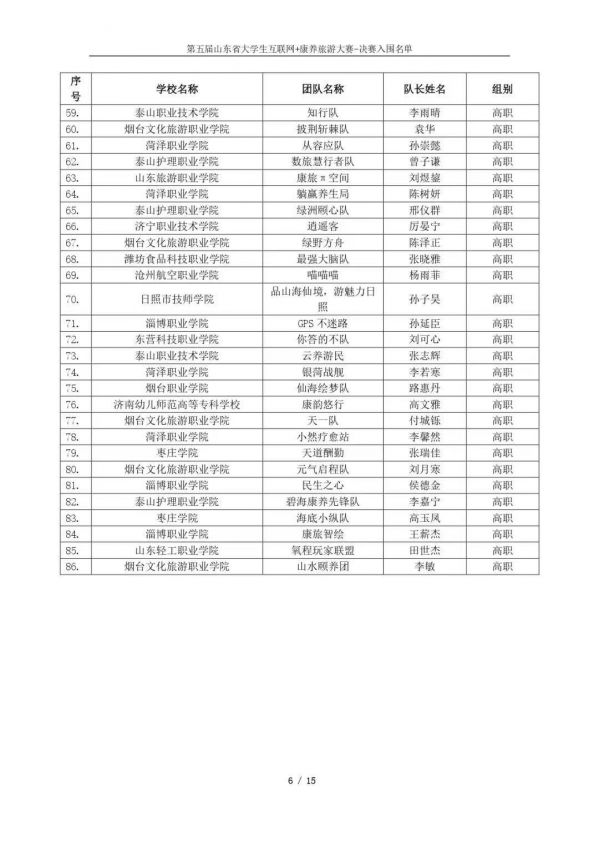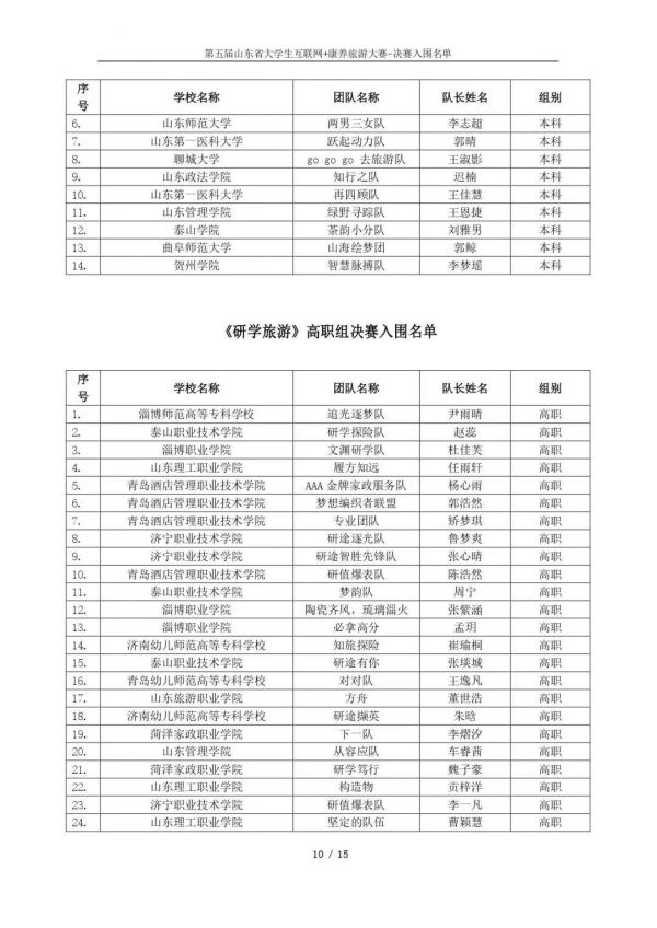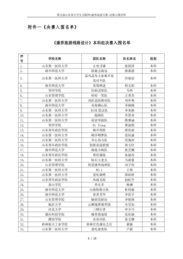 以下鏈接為第五屆山東省大學生互聯網+康養旅游大賽決賽入圍名單公示通知原文件:https://mp.weixin.qq.com/s/bd61lqBY3XZJo0ujX1mO_g?scene=1&click_id=2