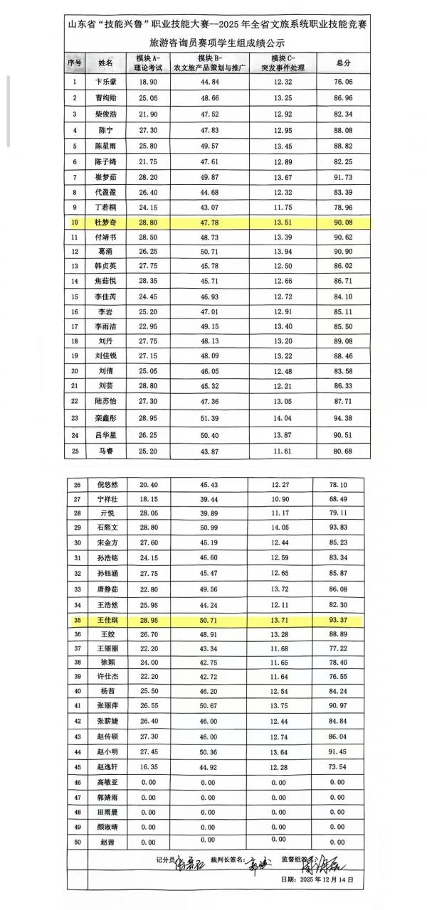 12142025山東省“技能興魯”職業技能大賽全省文旅系統旅行社咨詢員賽項圓滿落幕,聊城職業技術學院學生表現亮眼,劉寶平老師李雁老師的辛勤指導與精準賦能下王佳琪斬獲一等獎,杜夢奇榮獲二等獎。