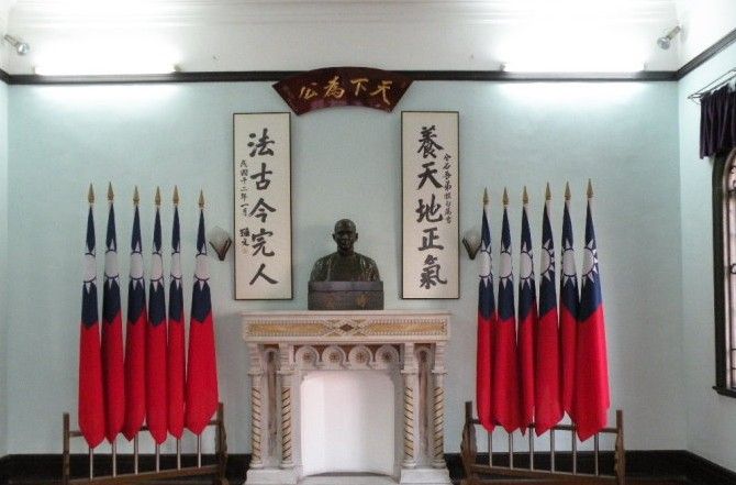 鐵門兩邊原本鑲有中國國民黨黨徽。「一二•三事件」發(fā)生後,當(dāng)時(shí)的澳門市行政局在1967年1月2日發(fā)出公告,禁止在澳門懸掛和顯示敵對中華人民共和國的外國旗幟、徽章和標(biāo)志。次日,澳門政府派員到該館拆除鐵門,并以專門訂造的,沒有中國國民黨黨徽圖樣的鐵門取代。不過,展覽館內(nèi)孫中山先生半身像兩旁仍然可以展示中華民國國旗,成為澳門唯一一處可以公開展示中華民國國旗的地方。