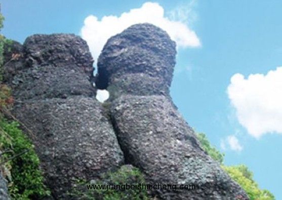 在羅漫山大石牌北端有一尊直徑約一丈,高約五丈的大石柱,它凸出石崖之外,下部同石崖連在一起,上部有分有合。從南邊看猶如一對年輕的情侶在接吻,從北邊看猶如兩位老人在接吻,所以人們稱之為接吻石,人們認為是神仙下凡變成的, 版權所有山東聊城聊之旅國際旅行社有限公司,轉載必究!是世界上獨一無二的奇特景觀,它同中國古代有關 “伏曦兄妹造人民”的神話故事有關,所以人們稱之為天下第一吻或仙人接吻。人們說接吻石是忠貞不渝的愛情楷模,它在演繹著千百萬年流傳下來的愛情故事,人們看到它都會有所感觸,特別是熱戀中的情侶必會熱血沸騰、情感升華……讓天下有情人為之動容!
