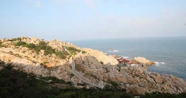沿著新修的水泥大道漫步上山,就來到了神石園的金山坳,從這里可以看到“金山寺”“百獸拜神”“百花園”“艾草埕”“海獅喜雨”“金字石”等景點。停車場的右邊山坡上是金山寺,寺雖簡陋,卻有兩百年歷史,它建于清中葉,里面供奉著佛祖釋迦牟尼。[1]“百獸拜神”是由山上的石景和海上的奇觀動靜結合組成的,它孕育著一個十分生動的傳說:媽祖升天后,其英靈馳騁在海面救苦救難;而海上鯊魚、鯨魚家族,仗著魚多勢眾,經常在海上興風作浪,危害百姓。為救黎民蒼生,媽祖決定與鯨鯊決一死戰。雙方約定,如果媽祖三招之內能制服鯨鯊,它們愿從此聽從媽祖調遣,并于每年三月二十三前來朝拜。媽祖施用“汲水法”,只一招就把鯊魚、鯨魚擱淺困住,動彈不得。從此,鯊魚鯨魚們遵守諾言,每年三月必成群結隊,千里迢迢游向湄洲島,遙對祖廟山朝圣,這就是當地人說的“海幫拜媽祖”的壯麗奇觀。