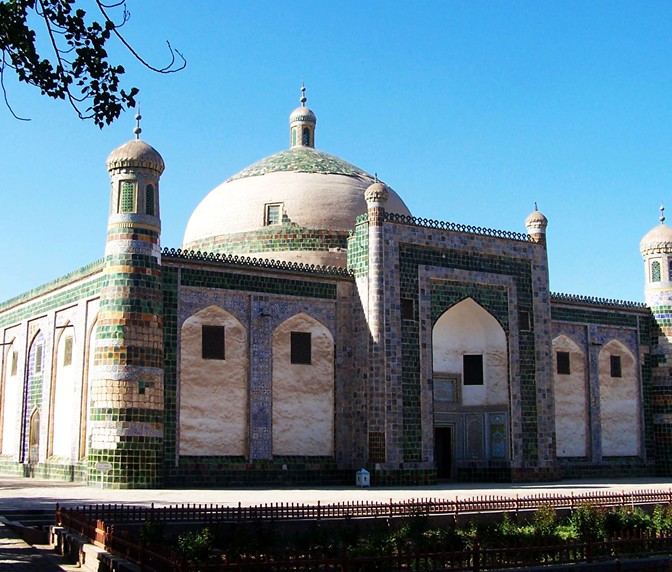 香妃墓坐落在喀什市東郊5千米的浩罕村,系自治區的重點文物保護單位。這是一座典型的伊斯蘭古建筑群,也是伊斯蘭教圣裔的陵墓,占地2公頃。 據說墓內葬有同一家族的五代72人(實際只見大小58個墓穴)。