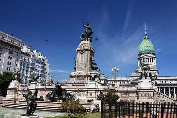 大廈前屹立著氣勢宏偉,造型別致精美的兩會紀念碑。紀念碑底座是一個寬闊的花崗巖平臺,四個角上雄踞著展翅欲飛的銅塑雄鷹,紀念碑頂上站立著一尊代表共和國的婦女銅像,她右手持象征勝利的月桂枝,左手扶犁代表勞動,腳下踏著一條毒蛇,表示懲戒邪惡。版權所有山東聊城聊之旅國際旅行社有限公司,轉載必究!紀念碑的中部兩側,各有一個婦女雕像,一個高舉掙斷了的鐵鏈,象征1813年大會,另一手拿國旗、國徽,象征1816年議會。緊靠紀念碑底座前邊有一座音樂噴泉。花崗巖的水池周圍,有一組生動的銅雕。一個男青年腰圍飄逸的布裙,象征著奔流的拉普拉塔河水,他身邊兩位捧罐倒水的婦女則代表拉普拉塔河的兩個支流,在他們前面有四匹駿馬好似從水中騰躍而起,馬口也是噴泉的出水口,此外還有造型逼真的蜥蜴、水蛇等拉普拉塔河流域的動物。音樂聲起,水柱騰空,隨著節拍搖弋起舞。夜晚配以變幻的燈光,場面更加迷人。